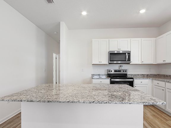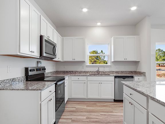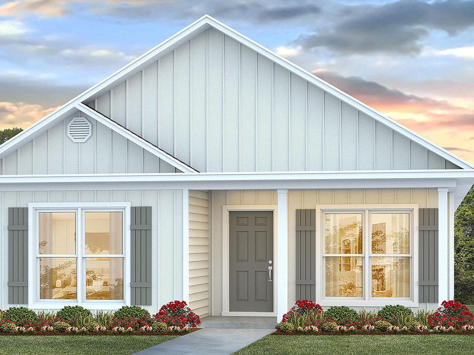The Owl's Head community is conveniently located off of Highway 331 in Freeport. We are only 8 miles to Interstate 10, and 16 miles to beautiful beaches and Highway 30 A. We offer 6 floor plans, 3 and 4 bedrooms. All homes have rear entry garages. This community offers a community area with paved walking trails and a spring fed lake. | The Porter plan is an open floor plan with 3 Bedrooms, and 2 bathrooms. It has a covered front porch. The primary bathroom has a separate shower and large soaking tub. Elegant, engineered vinyl plank flooring in the kitchen and living area pops against granite countertops and upgraded wall to wall carpet lines the bedrooms.