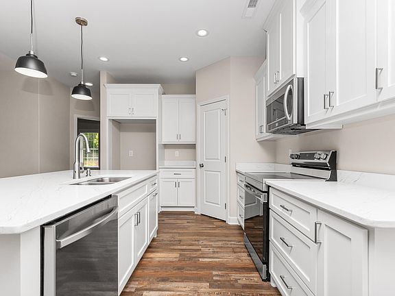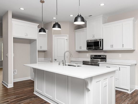This beautifully maintained, like-new home offers 3 spacious bedrooms and 2 full bathrooms with 1732 sq. ft. designed with an open-concept floor plan perfect for both everyday living and entertaining. The gourmet kitchen features a large eat-in island with a sink and dishwasher, sleek contemporary appliances, quartz countertops, custom cabinetry, and a pantry. Enjoy the upscale feel of 9-foot ceilings, recessed lighting, and blinds throughout, complemented by durable and stylish LVP flooring. The split-bedroom layout provides privacy, with the primary suite boasting a generous walk-in closet and a luxurious ensuite bathroom complete with dual vanities, a large walk-in shower, garden tub, and a linen closet with wood shelving. Exterior features include charming board and batten Hardiplank siding, a covered concrete back porch, and a fenced backyard for added privacy. The home also includes a two-car garage with opener and a concrete driveway. Located in a highly convenient area close to shopping, dining, and commuter routes, this home blends comfort, style, and functionality.