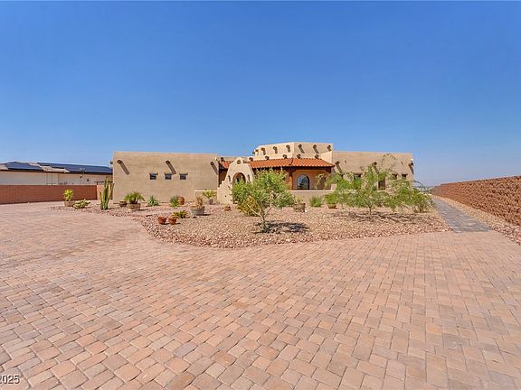 Experience desert luxury in this custom adobe-style single-story on a 0.74-acre lot with sweeping views from nearly every room of the Strip, mountains, and city lights. Inside, enjoy vaulted ceilings, surround sound, custom cabinetry, and a brand-new LG fridge and dishwasher to match the existing suite, plus generous use of marble throughout bathrooms, kitchen, and laundry. Full-height pocket doors with electric shades in the living room offer control over afternoon sun without sacrificing natural light. The spa-like primary suite features a copper soaking tub, stone sinks, enclosed shower, and spacious walk-in closet. Two additional bedrooms offer en-suites and walk-ins. Recent new upgrades include dual HVACs systems with Aprilaire MERV 2 air filters, NOVO softener, hot water recirculator, and water heater. Outdoor living includes multiple patios, rooftop deck with wet bar plumbing, and two fire features. Oversized 2-car garage plus RV/open parking. Offered furnished—buyer's choice.