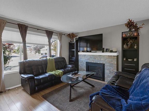 Gas brick fireplaceLaminate wood flooringBuilt-in shelvingLarge front windowMaple cabinetryIsland with breakfast barLots of cupboard space