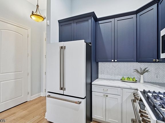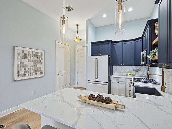 Modern living abounds in this newly renovated, sun drenched, first floor, loft style condo. An open floorplan coupled with exceptionally high ceilings, large windows allowing in extraordinary light, and freshly refinished oak flooring throughout gives this special unit an impressive feeling of light and spaciousness. The kitchen has been reimagined with a stunning marble backsplash set in a sophisticated herringbone pattern, new quartz countertops, and a suite of matte white GE Cafe appliances with brushed bronze hardware. Opening out from the kitchen breakfast bar, the living/dining area is open and welcoming to simple relaxation or robust entertaining. Two large bedrooms flank the luxurious main bath with marble tile floor and walls, and a walk-in shower tiled in gorgeous marine blue ceramic tile with brass rain head shower and handheld wand. The extra-large primary bedroom has a special reading nook and two large, fully customized walk-in closets. Second bedroom is also large with its own customized closet and soaring ceilings. Central air conditioning. Laundry in unit. Two assigned parking spots in dedicated lot. Convenient to Bloomfield Center, Montclair, Montclair State University, GSP and more. Pets welcome.