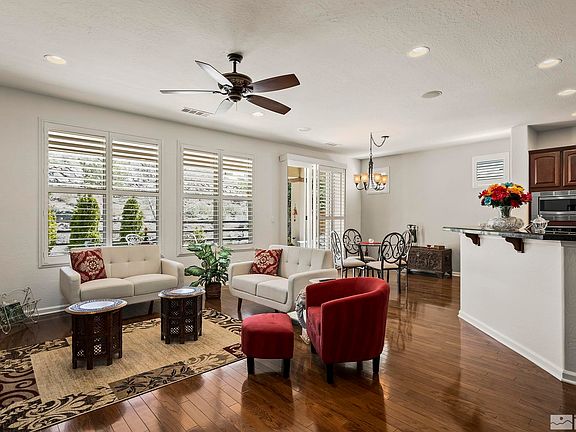 Welcome to this stunning property located in the desirable Sierra Canyon at Del Webb 55+ community. This immaculate home boasts 2 bedrooms, 2 bathrooms, and an office, providing ample living space for you and your loved ones. The extensive upgrades that have been added to this property make it truly inviting. The hardwood flooring, porcelain tile and newer carpeting give a warm and inviting feel to the entire home. The covered paver patio and front courtyard, also with pavers, provide a perfect, outdoor living space for entertaining or simply relaxing in the beautiful Nevada sunshine. Custom lighting and fans, shutters, and granite countertops all contribute to the high-end finishes found throughout this property. The cherry finished cabinetry (with double pull-outs) and stainless steel Frigidaire appliances add a touch of elegance to the kitchen, which also features a Jenn-Air Stainless Steel refrigerator. In addition to all the impressive upgrades and features, this property also has a bay window in the primary bedroom, providing a relaxing sitting area with a beautiful view of the garden. Imagine waking up in the morning and enjoying a cup of coffee while taking in the serene scenery from the comfort of your bed. The garden itself boasts a rock fountain that provides a peaceful and tranquil atmosphere, creating the perfect place to unwind and enjoy your private outdoor oasis. This property has been well maintained, plus the garage has custom cabinetry and flooring, providing additional storage space and making it the perfect workshop for all your hobbies. One of the most significant advantages of this property is its location, just blocks from Aspen Lodge. The patio provides protection from the wind and the sunny side of the street ensures that snow on the driveway and walkways melts more quickly. This stunning home is a gem that has been upgraded to high standards. With its prime location, extensive upgrades, and custom features, this home is a must-see for anyone looking for a rich and peaceful lifestyle in the Sierra Canyon at Del Webb 55+ community offering access to all the amenities you need to live your best life. From community events and classes to fitness center, pool, spa, meeting rooms, pool room, library, indoor walking track, tennis, pickle ball, golf and unlimited social life, there's always something to do. Don't miss out on the opportunity to make this beautiful property your own. Contact us today to schedule a showing!