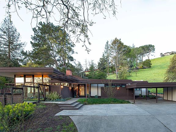 Stunning mid-century modern home by architect Karl Kolbeck. This renovated beauty sits atop a private driveway on a 1.5-acre lot with spectacular views of Mt Diablo. Home has been extensively updated while keeping all the mid-century design features with clean lines, open floor plan and floor to ceiling windows. New kitchen with custom cabinetry, Caesarstone counter, Miele appliances with wood-cabinet facing and Heath tile backsplash. Primary bedroom with private outdoor area, walk-in closet, and updated bathroom. 4 additional bedrooms, 3 with closet organizers, 1 with custom solid walnut built-ins for home office. Original slate entry with atrium, hardwood floors, brick fireplace, built-ins, wood detailing and custom window coverings. Owners have updated the roof, plumbing, electrical, exterior siding, added dual pane windows, tankless water heater and HVAC system. Hall bathroom has been modernized with double sinks, soaker tub / shower combo and rolling shower door. Indoor laundry room with tile, concrete counters, floating bench and half bath with custom cabinet and sink. Large landscaped front yard, outdoor kitchen, and covered parking. Huge lot for play structure, possible ADU or land split? This is a must see.