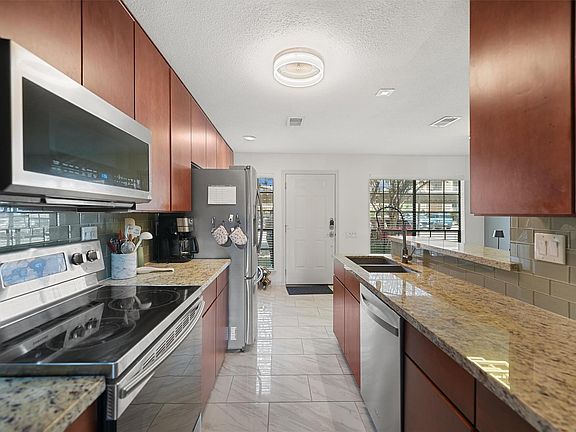 Updated two bedroom, two and half bathroom in the gated community in the Heights. Kitchen features granite countertops with tiled backsplash, breakfast bar, stainless steel appliances and dining room for lots of guest. The bright living room has french doors that open onto a patio which features an amazing view of downtown Houston a perfect spot to view fireworks. Upstairs are two bedrooms with the primary opening to a balcony to sip, relax and read. Across the street there are hike and bike trails to Memorial Park or downtown. Always wanted to ride to work - you can do that here! Two covered parking spots! Two pools, water, internet, garbage, gate and lawn included.