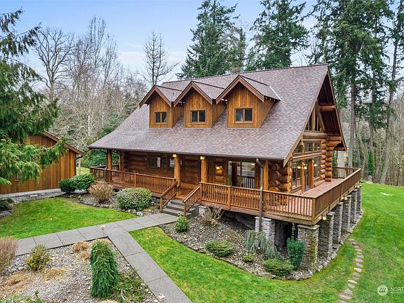 Your next chapter starts in a fairy tale! Unlike anything you've seen before. This incredible log home built w/ 18 to 24 diameter logs is situated on pristine and low maintenance 1.26 acres, privately tucked away on a quiet, paved street behind popular golf course. Mostly flat grounds packed with mature landscaping, flagstone fire pit area abutting 219 feet of creek frontage featuring spring run Salmon. Main floor primary bed w/ spacious walk-n closet and updated 5 piece en-suite. Over 50 solar panels for efficient living w/ low energy bills! Gorgeous territorial views from every angle along the covered wrap around porch. Shop is the perfect set up for hobby enthusiasts! Tranquil & functional wrapped in breathtaking charm!