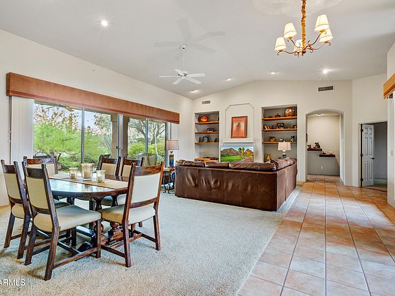 Golf course setting in the gated golf community of Tonto Verde. Located on the 17th hole of the Peaks GC. This split floorplan has 2 bedrooms plus a den/3rd bedroom and 2 baths. Great room with dining and access to the spacious covered patios. Kitchen with granite counters , island, casual dining and patio access. Mature landscaping and a tranquil setting, plus 7 Saguaro cacti on the property. Stairway to the stars to enjoy golf course and mountain views. 2 car plus golf cart garage and bonus workroom. Come and see!