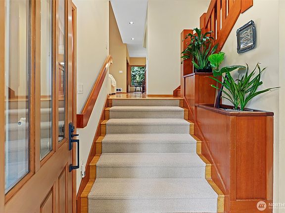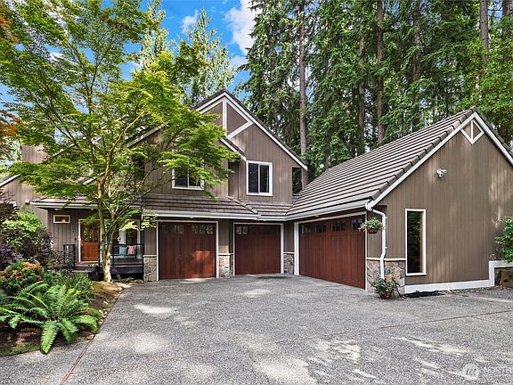 Live the dream on this shy acre of serenity w/ Lake Sammamish & mountain views! Tucked away down a private lane, on a private lot, this unique property features meandering stream, tranquil pond, fire pit & "retreat" cave with 640 sq ft. 3 decks with lake views from the living spaces and primary bedroom. The remodeled kitchen shines w/ modern upgrades & beautiful Bertazzoni range. The detached cabin offers the perfect retreat for entertaining/bunk/work from home space. Lifetime tile roof adds durability & elegance. Wired for generator, which stays. 4 car garage, refinished hardwoods, new carpet, new windows & remodeled baths. Seclusion, scenery & wildlife all with PNW style—this property truly has it all! Easy i90/commute to city life.