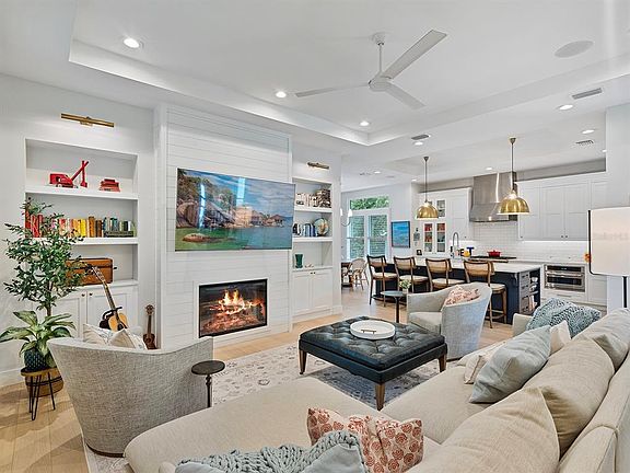 Built by Meridian Homes in 2023, this newer construction, five-bedroom, five full- and two half-bath residence combines timeless coastal architecture with a fresh, modern sensibility. Designed by Lauren Ayers Interiors, every detail of this home exudes style, sophistication and livable refinement. A charming façade and manicured landscaping create picturesque curb appeal, welcoming you into a beautifully curated interior featuring wide-plank hardwood floors, custom cabinetry by Monarch Kitchens & Baths and designer finishes throughout. A light-filled office with a wood-paneled accent wall and walk-in closet sits in front of the home, offering a space for work or study. The spacious kitchen is a chef’s dream, anchored by a large center island with seating, Wolf range, GE Café double oven/microwave, and undercounter beverage fridge, and opens seamlessly to the inviting living room with gas fireplace and custom built-ins. The dining area, adorned with a Rifle Paper Co. accent wall, features sliding glass doors that open to the covered lanai, extending the living space outdoors. The private primary suite offers direct access to the lanai, a large walk-in closet, and a spa-inspired bath with an oversized glass shower. A guest suite with en-suite bath is also on the first floor, along with a powder bath and spacious laundry room. Upstairs, a family/bonus room provides flexibility for a media space, study area or playroom. Three additional bedroom suites, each with private en-suite baths and generous closets, complete the second floor. The covered lanai serves as an elegant outdoor retreat overlooking the heated saltwater pool and spa. The detached two-car garage has been thoughtfully extended to include a fully equipped summer kitchen with built-in grill, vent hood, sink, undercounter fridge, pool bath and outdoor shower area. The driveway with automatic gate adds privacy and convenience. Additional highlights include custom wood shutters on all windows, built-in surround sound and whole-house network, and floor-to-ceiling tile in every bath. A short distance to Lakemont Elementary and just minutes from Park Avenue and downtown Winter Park, this home offers an unmatched combination of design, comfort and sophistication, near the best dining, shopping and recreation Central Florida has to offer.
