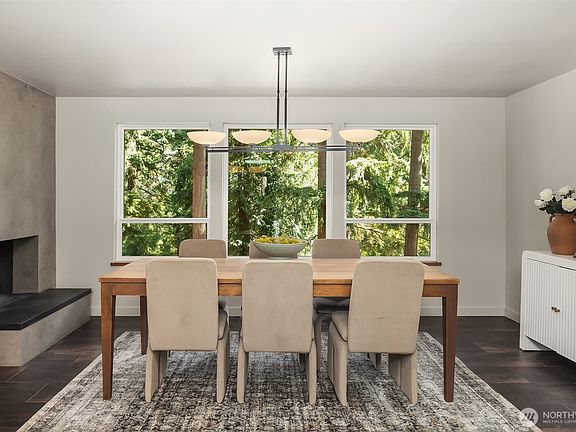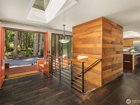 This PNW retreat resides on a wooded acre, with 100+ year old evergreens, fruit trees and a seasonal creek. This home's architecture evokes a distinct Mid-Century feel; real walnut veneer Henrybuilt cabinetry, 3 fireplaces encased in statement concrete walls, clean lines and ample natural light. A chef's kitchen is at the heart of the main floor, with double ovens, prep sink, walk-in pantry and high end appliances. 3 bedrooms are also on the main, including a primary suite with 5-piece bath and radiant floors. The daylight basement includes a family room, office and a versatile guest room with its own entrance and adjacent bathroom. New septic in 2018, 3 EV chargers, many new windows and an automatic generator are some of the many upgrades!