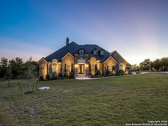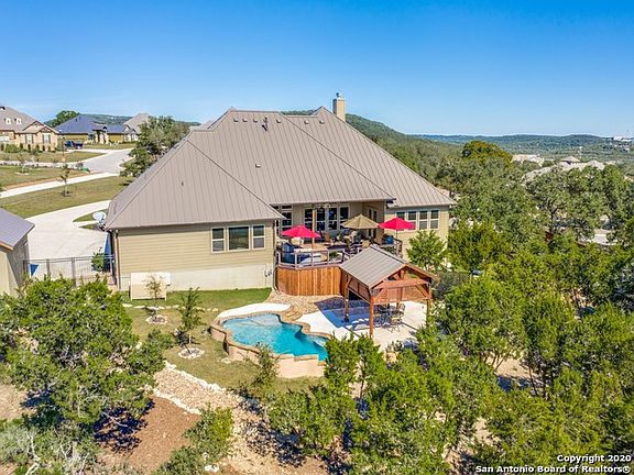 Exquisite 1 story residence, gorgeous exterior with recently installed Metal roof situated on 1.02 acres, backs to Gov't Canyon! Outdoor fireplace, expanded deck with hot tub overlooks the gorgeous gardens with gazebo and a stunning custom pool, installed in the 2020! This is the home you have been searching for featuring wood flooring, architectural details from the entry with barrel ceiling, family room with high tray ceiling, floor to ceiling stone fireplace, wall of windows with view to the deck, expansive gardens and pool. Perfect open plan living with a statement gourmet kitchen with custom cabinetry, a separate wine bar/ buffet, impressive gas range, dramatic quartz island with breakfast bar and a designated breakfast area that all flows to the family room. An elegant dining room for entertaining at home. Spacious owners retreat with double tray ceiling and crown molding. Spa bath with jetted tub, floor to ceiling glass oversized shower, 2 vanities, 2 large closets and motorized custom window shade! A separate office and secondary living space for game room, currently set up as a home gym with outdoor deck access. Convenient drop zone, a utility room with cabinetry, sink and folding counter. Split plan for privacy and 3 elegantly appointed secondary bedrooms complete this perfect property! Impeccably maintained and additional significant improvements including a 4th separate garage, privacy fencing, surround sound, designer fixtures and much more- your dream home awaits!