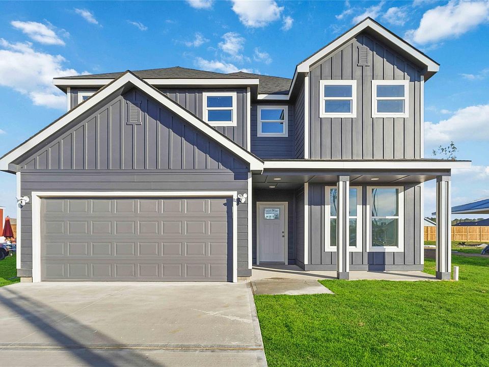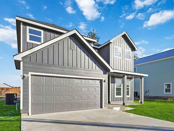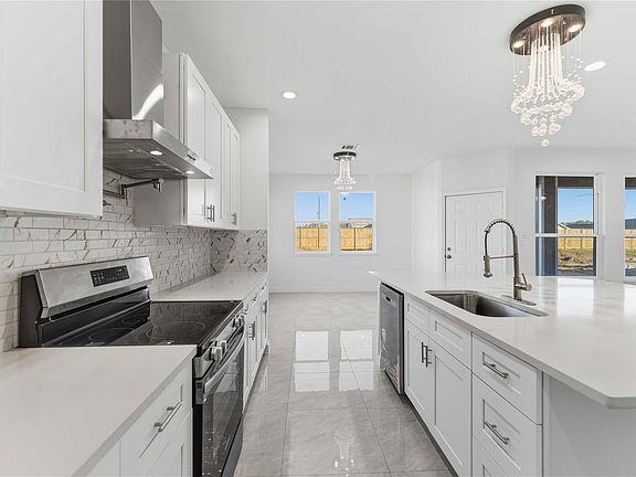This newly constructed two-story home features a modern exterior with a covered front porch, an extended driveway for ample parking, and an attached two car garage. A grand entry with soaring ceilings welcomes you into an open concept layout with recessed lighting and large format tile flooring throughout the main living areas. The kitchen offers an oversized quartz island, stainless steel appliances, custom cabinetry, designer backsplash, and pendant lighting. Living and dining areas flow seamlessly for easy entertaining. The primary suite includes private balcony access and a spa style bath with soaking tub and dual vanities. Additional baths feature sleek modern finishes. A covered rear patio overlooks the backyard. Energy efficient windows, neutral tones, and clean lines complete this home’s fresh, sophisticated appeal.