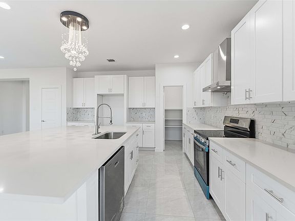 Modern exteriorRecessed lightingStainless steel appliancesOversized quartz islandAttached two car garageNewly constructed two-story homePendant lighting