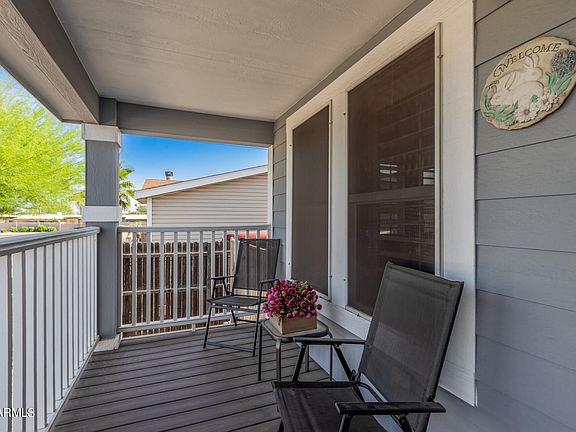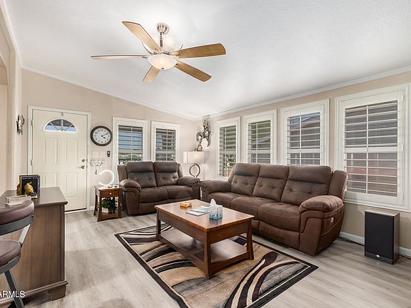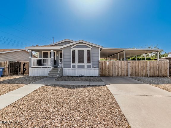 Discover your perfect retreat in North Phoenix! Step inside this beautifully renovated 2 bedroom, 2-bathroom manufactured smart home. This amazing gem boasts high 10-12 ft ceilings and dimmable/controlled lighting. The updated kitchen features crown molding, under counter lighting, tiled backsplash, granite countertops and a re-designed island/peninsula. Enjoy the convenience of newer AC unit (2023), newer appliances (2022+), enlarged showers, ''floating'' bathtub and vinyl flooring.