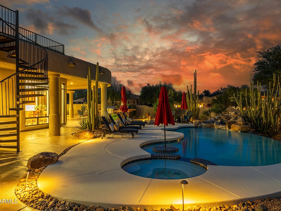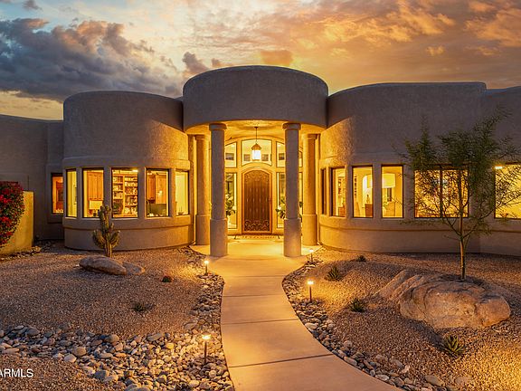 The heart of this abode is its grand living room, an entertainer's paradise framed by a semi-circular wall of windows that gaze upon the majestic Four Peaks. A generous office space, complete with custom built-in cabinetry, adds functionality and style to the home.