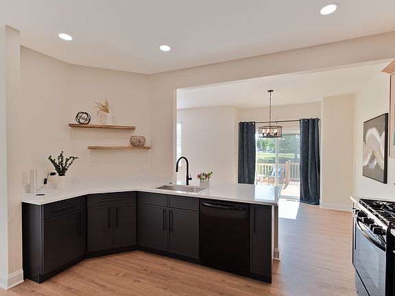 Stylish vinyl flooringPeaceful viewsSleek two-tone cabinetsQuartz countertopsFinished english-style basementBlack stainless steel appliances