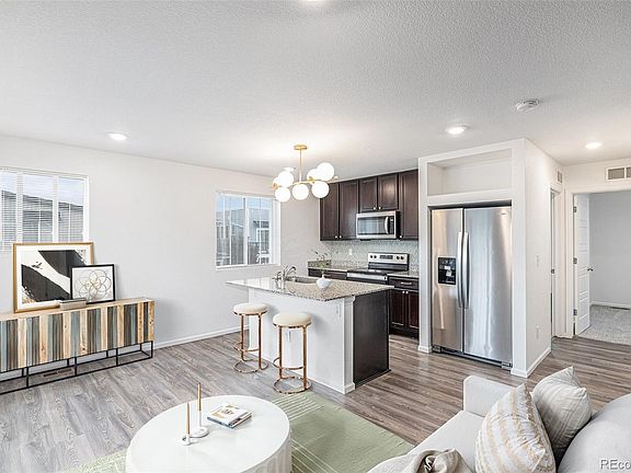 Welcome to this beautiful TRUE 3-bedroom home with a versatile bonus room! Thoughtfully updated with chic West Elm lighting, brand-new carpet and fresh paint, and stylish hardware and fixtures throughout, this newer property is move-in ready and full of character. From the moment you step inside, you’ll be greeted with abundant natural light, stylish finishes, and a floorplan designed for both comfort and flexibility. The entry-level bonus room offers endless possibilities—whether you’re dreaming of a home office, creative studio, or non-conforming 4th bedroom, this space adapts to your needs. The main level serves as the central hub of the home, where the kitchen and living area connect to create a welcoming space for daily living. The kitchen makes a statement with its chevron tile backsplash, brass accents, and striking West Elm fixture, while the adjoining living space flows out to a front deck—perfect for enjoying your morning coffee or winding down with a glass of wine in the evening. Two guest bedrooms and a full bath refreshed with designer details complete this level. Upstairs, the private and spacious primary suite offers a generous walk-in closet and en suite bath, also enhanced with stylish finishes, creating a retreat that feels both elevated and serene. And to top it all off, a brand-new roof is being installed, giving you peace of mind for years to come. The location makes everyday living a breeze. Nestled in a vibrant and growing community, you’ll enjoy quick access to major highways and DIA, with shopping, dining, and entertainment close at hand. Nearby parks, trails, and open space create the perfect backdrop for an active Colorado lifestyle. Whether commuting downtown, catching a flight, or exploring the outdoors, this home keeps you close to it all.