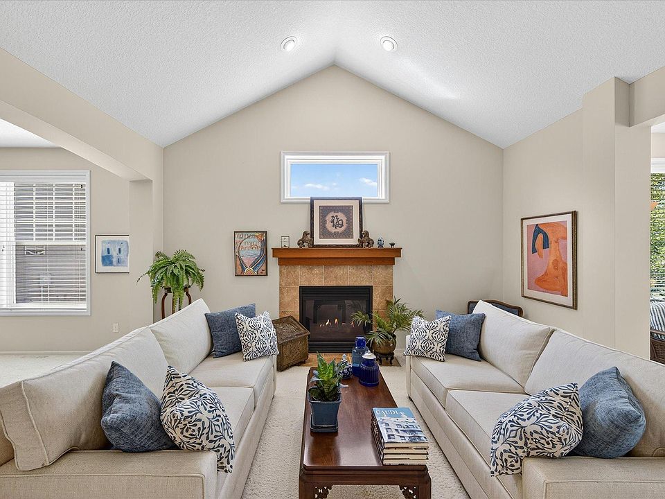 Quality flooringOne level livingVaulted ceilingsLiving and dining roomPrimary bedroom suiteCustom window treatmentsSolid stone counters