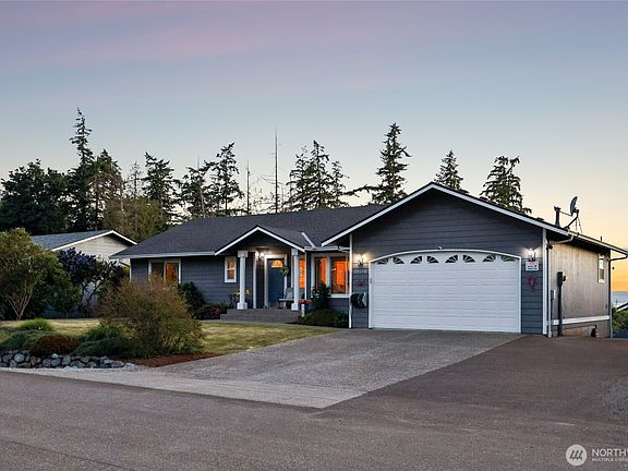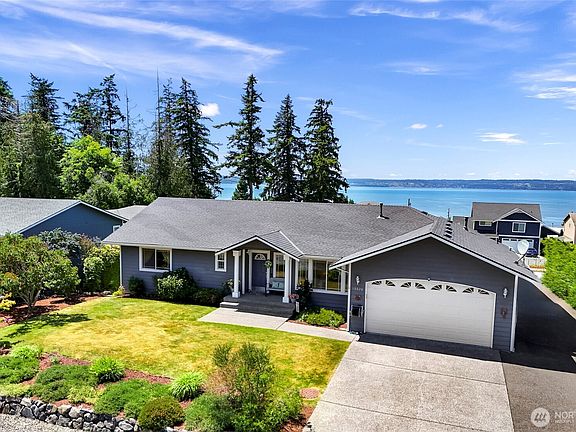Welcome to your dream rambler with a daylight basement in Warm Beach, featuring breathtaking west-facing water views! This home offers convenient main-level living, complete with vaulted ceilings, a cozy pellet stove, and a spacious kitchen equipped with slate appliances. The primary suite includes a private deck, an updated en-suite bathroom, and a walk-in closet. The lower level boasts a large recreation room, a third bedroom, a ¾ bathroom, and a bonus room that can serve as an office or a fourth bedroom. Outside, you will find lush gardens, a view deck, a 2-car garage with an EV charger, and parking space for an RV or boat. Additionally, you can enjoy the community center, which features sports courts, picnic areas, and various events!