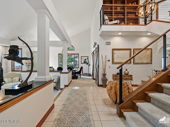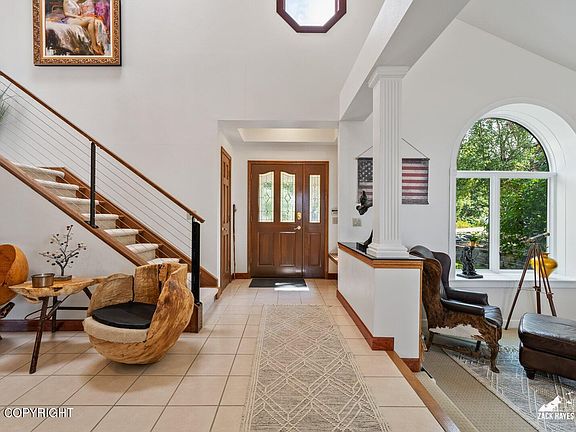Spectacular home with breathtaking inlet and mountain views capture your attention from every room. The stunning vaulted ceilings and large windows allow for sun drenched living areas. The spaciously designed open concept kitchen with stainless steel appliances, custom cabinets and granite countertops is situated perfectly off of the formal dining room. The 2nd living area with wood burningfireplace and "wine room" is everything you need for entertaining or simply relaxing. Featuring custom lighting throughout, gas fireplaces, new interior paint, central vac, remote WI-FI home temperature control, and security throughout with a ring camera at both front and back of home as well as a Guardian Security System. Relax in the spacious primary suite with a large walk-in closet and spa bath featuring a soaker tub, walk-in shower, large bay windows and private balcony overlooking the inlet. It is truly a serene retreat. Upstairs features 2 additional bedrooms with mountain views, as well as 1 additional full bath. The over 1200 sq ft finished daylight basement with kitchen, living and dining area, custom built in shelving, full bathroom, bedroom and bonus room, private entrance and an abundance of storage. This offers a variety of options, including an in-law floor plan, income potential, or space for growing families. There is plenty of room for everyone to enjoy. Outside, the huge decks upstairs and downstairs offer multiple seating areas for enjoying Alaska's delightful summers, the neighborhood wildlife, and astounding views. The backyard, with mature trees & shrubs, affords you privacy and serenity. The beautifully landscaped front yard demands attention from passers-by with gorgeous flowering trees. This lovely home offers inspiring spaces for enjoyment outside and in, whatever the season or weather. Welcome home to 18628 Harlequin Place.