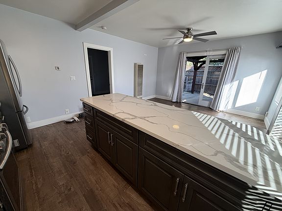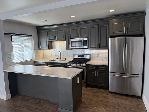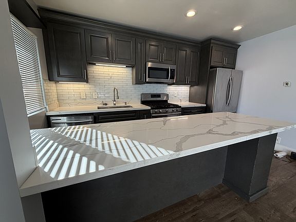 This beautifully updated unit has been completely remodeled from top to bottom. Through the front entry, you're welcomed into a bright, open-concept living room and kitchen featuring a spacious center island perfect for entertaining. The kitchen has been thoughtfully renovated with sleek grey cabinetry, white marble countertops, and a clear subway-tile backsplash for a clean, modern look.