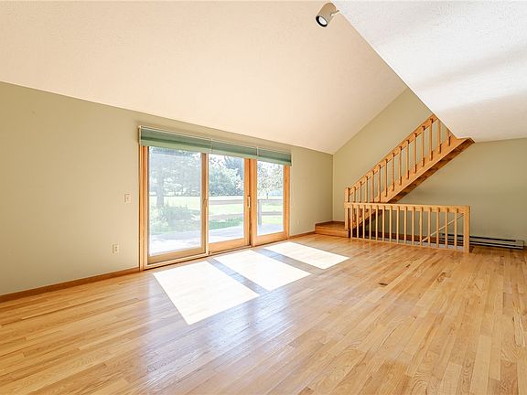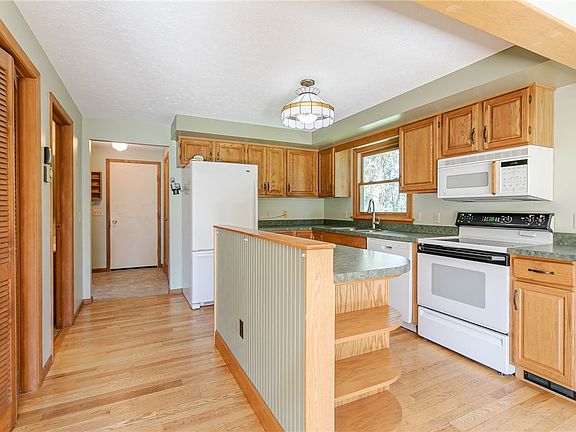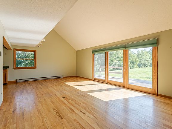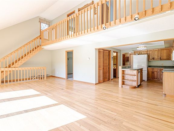 This inviting 3BR, 2 Bath, 1463 SF Colonial features a welcoming foyer with open-concept vaulted ceilings and a loft office with a charming wood railing. The kitchen is equipped with an electric stove, microwave, dishwasher, refrigerator, two large windows, and a sliding door that opens to 8 acres of scenic beauty. The first floor boasts a convenient laundry room with extra storage and a washer/dryer included. The 1st floor primary bedroom offers a full bath and a closet with hardwood floors. The deck includes a concrete slab and is wired for a hot tub. Upstairs, you'll find two bedrooms and a full bath, including an updated shower with glass doors and tile flooring. The second bedroom has a private patio overlooking trees and a pond. The partially finished basement features vinyl plank flooring, a wood stove with wood storage, an electric heater, and a water softener. Other notable updates include a new hot water tank in 2020 and a well with a 150 ft depth and a water pump installed in 2007. The property also has a septic system and offers a great location. Delayed Negotiations Wed (9/27) @ 10AM