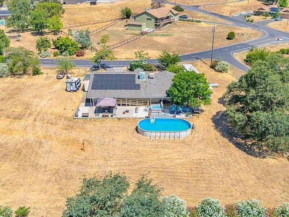 Welcome to your dream country home, situated on a spacious and level, fully-fenced acre just minutes from Lake Tulloch! This fully-updated gem features owned solar panels and new dual-paned windows for exceptional energy efficiency. Step inside to a bright and inviting great room adorned with elegant wood-look flooring, a cozy wood stove, and crown molding throughout. The heart of this home is the dream kitchen, complete with a spacious eat-in island that seats four. You'll love the farmhouse pendant lights, under-cabinet lighting, brand-new Shaker cabinetry, quartz countertops, and the stunning glass backsplash. The kitchen also boasts new stainless-steel appliances, a gas stove with pot filler and hood, a pantry closet with a glass door, ample storage, and a farmhouse sink with a large window that frames the beautiful backyard. Adjacent to the kitchen, step down to a fantastic bonus room, perfect for a formal dining room, den, or even a fourth bedroom option! Sliders from the bonus room open to the ultimate entertaining backyard. Enjoy shade and sun patios, a bubbling hot tub, a large above-ground pool with a filter system and surrounding decking, a shaded hammock and lounging area, a pergola, garden boxes, and so much more. No carpeting in this home, the wood-look flooring continues down the hall and into the three bedrooms, including a primary bedroom with an updated en-suite bath. The additional updated hall bath has a gorgeous new vanity, tub and shower for guests. Every inch of this home has been updated with tasteful, on-trend finishes. The attached 2-car garage features plenty of shelving, while an adjacent custom-built shed provides extra storage and a place to tinker around on projects. The side yard includes a metal-top boat storage shelter and additional space for toys and RVs. Copper Cove residents gain access to all the wonderful amenities with a cost of just $24.00/mo. including a boat launch, docks, beach access, and more at the KIVA, as well as nearby Black Creek Park with a clubhouse, gym, sports fields, riding trails, frisbee golf, and horseshoe pits. Your new home is just minutes from Copperopolis Town Square and HWY 4, making commuting to the valley or the Bay a breeze. Historic downtowns can be explored in every direction both up and down HWY 108 and 4 and wine-tasting adventures await in Angels Camp, Murphys and beyond. Affordable, low-maintenance living in a beautiful, rural location with endless outdoor adventures right out your front door... what more could you ask for?