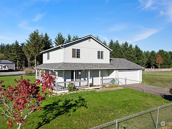 Welcome to this charming 2-story home nestled on over 1 acre of land. A rare find w/ level, usable land. The wrap-around porch creates a warm & welcoming entrance, setting the stage for the character & grace found within this home. This home boasts a spacious & airy living area that provides the perfect gathering space for entertaining. The kitchen features SS appliances, a pantry, & an ample storage area. Upstairs, you'll find three spacious bedrooms, including a primary suite w/ a private bathroom & walk-in closet. New roof and fence in 2018. Enjoy the serenity of country living while being just minutes away from all the conveniences of I5, restaurants, shopping, and only 1 hour from the beach.