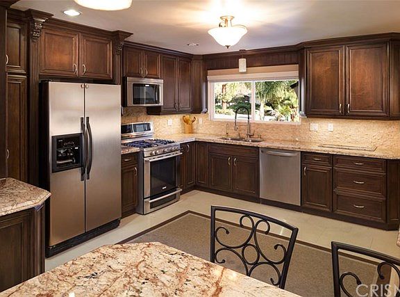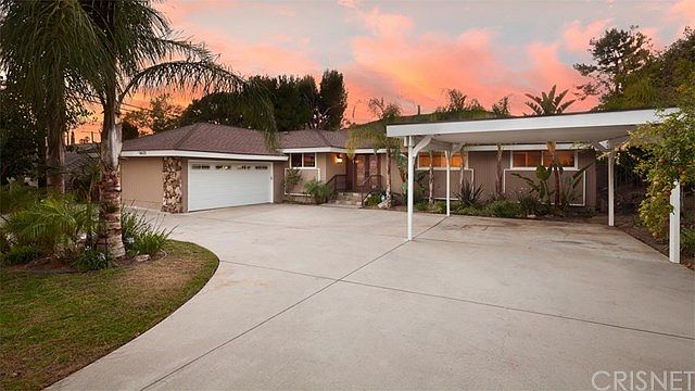 Gorgeous Porter Ranch 1-sty home! Stunning remodel! 4 br's, 2 ~ ba's, living rm, fam rm, dining rm, cook?s gourmet kit, master br w/private ba & walk-in closet. Kit w/custom maple cabinetry, built-in breakfast bar w/granite counter top, recessed under cabinet & ceiling lighting, granite counter tops, 5-burner gas range/oven, mw & dw. Floors r porcelain tile w/limestone back splash. Custom glass & wrought iron front doors. Liv rm w/custom Rainforest brown marble fireplace, mantle & hearth w/travertine floors. Din rm w/custom built dual level maple cabinet bar w/Rainforest brown marble counter top & travertine flr w/slider 2 back yard. Fam rm w/sliding glass door, ceiling fan & an illuminating Coral reef fish tank. Bk yard w/pool w/child proof fence pool, covr'd patio/pergola, custom outdoor entertaining/kit area, w/custom DCS built-in appliances incl: 36 inch stainless steel BBQ, stainless steel mini refrigerator & 2 burners. Granite counter top bar, fire pit w/built-in seating area & grassy area. Attach'd garage w/direct access + carport, cement circular drive, gated RV access on the side of the house & RV access in front. Custom built tool shed included! Copper plumbing, CR & FA, all br's w/oak flrs, crown molding, new paint in & out, dual pane windows!