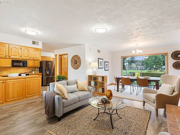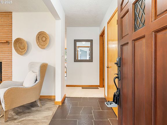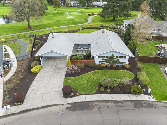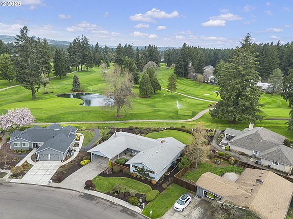 Stunning residence nestled on the 13th hole of the Willamette Valley Country Club Golf Course. This immaculate home offers a harmonious blend of mid-century modern elegance and comfortable living, making it a perfect sanctuary for discerning homeowners. The open-concept design boasts expansive living spaces and abundant natural light. Features 5 beds/3.5 baths, a bonus room, 4 fireplaces including a pellet stove and picture windows. The main-level living space includes a living room, two family rooms and a formal dining room. Nice kitchen with tile counter tops, custom cabinetry, and appliances; dishwasher, microwave, range, trash compactor and fridge. 3 bedrooms on main includes a private suite with double closets. Convenient laundry room with washer/dryer adds additional storage. The finished basement features a large bonus room with a fireplace, two bedrooms and a full bath. Ideal for home office/hobby/creativity/play room or potential for ADU. Step outside to a well maintained, beautifully landscaped front and backyard with a spacious patio, perfect for outdoor dining and enjoying the picturesque surroundings of the golf course. Don't miss this rare gem - a place you'll be proud to call home.