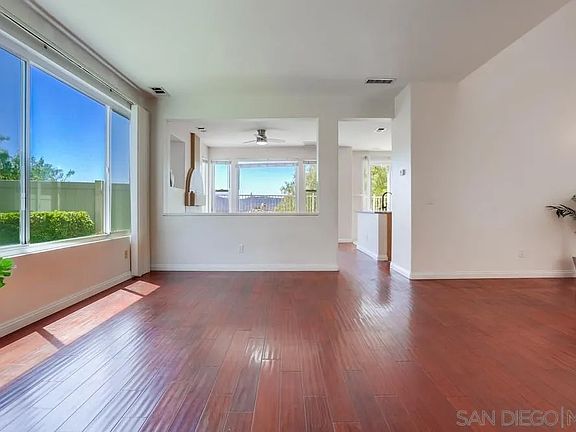 Enjoy breathtaking panoramic westerly sunset views, located at the highest point in the complex. This spacious townhome features a bright, open floor plan with a kitchen that flows seamlessly into the family room, a large living room, and a 2-car attached garage. Upgrades include hardwood flooring, newer stainless steel appliances, washer & dryer, and abundant storage with walk-in closets plus additional storage areas. The backyard and patio offer incredible panoramic views that make this home truly special. Residents enjoy access to a Resort-Style Recreation Center with two pools, two spas, tennis courts, gym, banquet hall, birthday party facilities, scenic trails, and more. Conveniently located just seconds to Hwy 15 yet away from highway noise. Award-winning schools: Chapparal Elementary, Bernardo Heights Middle School, and Rancho Bernardo High School. No Mello Roos!