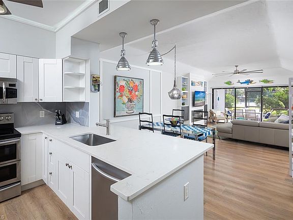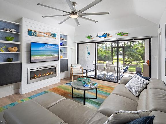 Fabulous updated condo in centrally located Kings Lake! Just 3 miles to Old Naples and the pristine beaches, fine dining and shopping. This condo has an expansive great room with volume ceilings, a built-in electric fireplace wall with shiplap, storage and a place for your TV, the living room looks out on the landscaped area and is steps from the tennis and pickleball courts and the community pool. The kitchen offers a convection oven/microwave, breakfast bar with seating and a pantry for maximum storage. The main bedroom suite has a double vanity, walk-in closet, and built-in storage. There is also a separate office space with additional storage as well as a new stackable washer and dryer. Plus, there is an assigned car port space to keep your car cool. If you enjoy walking, the community also offers a large lake with walking paths. Offered furnished, but flexible.