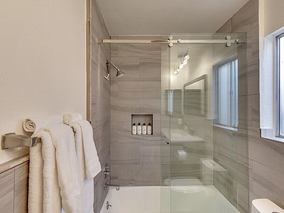 Master suite has a private bath (shower/tub), walk-in + extra closet, and breezy windows. Second bedroom is sunny with two closets and its own renovated stand-up shower bath.