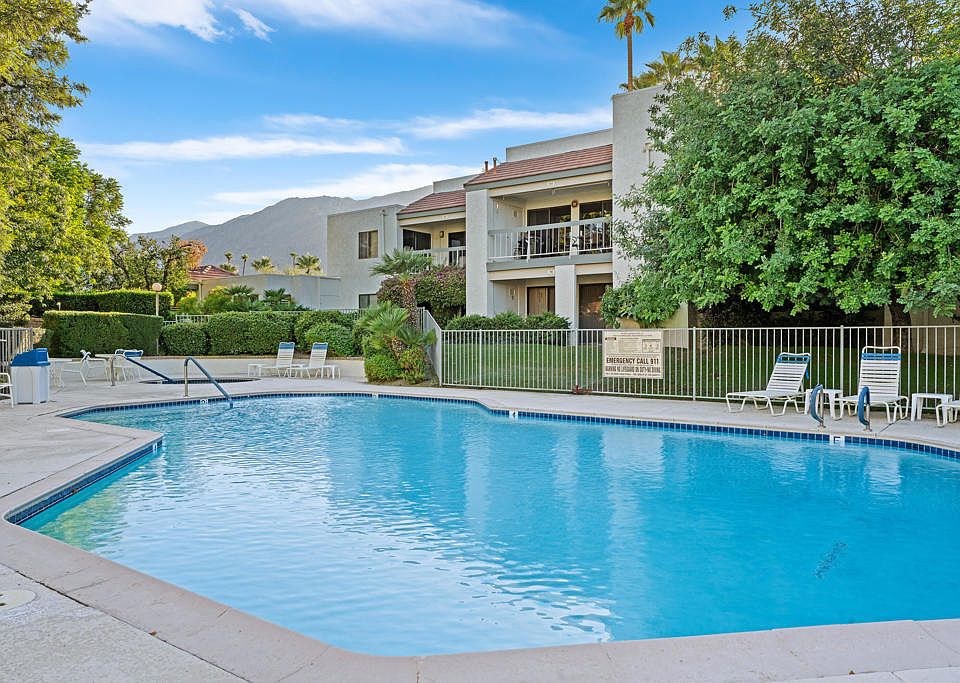 This 2 bedroom, 2 bathroom, 1,034 sq. ft. condo in the desirable Riviera Gardens community offers the ideal Palm Springs lifestyle. Smartly updated and move-in ready, this property sits on fee land (no land lease) and presents a fantastic investment opportunity.The kitchen has been upgraded with a brand-new refrigerator, newer appliances, granite counters, furniture-grade cabinetry, and a stylish backsplash. The convenience of inside laundry with newer stackable appliances adds to the functionality of the home. Other updates include newer carpet, fresh paint, and a primary suite enhanced by a newer tile shower. The second bedroom provides flexibility to serve as a guest space, home office, or game room.A spacious balcony patio extends the living area and is perfectly designed for entertaining, featuring a natural gas barbecue (no propane required) and showcasing panoramic views of the pool, spa, and surrounding mountains. The location within the community is exceptional, just steps away from both the pool and spa.The grounds of Riviera Gardens continue to evolve with a thoughtful transition to desertscape landscaping, balanced by a mindful approach to preserving and caring for an impressive collection of mature fruit trees, including fig, orange, grapefruit, lime, lemon, key lime, mandarin, and olive, which are located just outside the door. Parking is convenient with a dedicated covered carport located only steps from the unit, as well as ample guest parking for visitors.This home is being offered fully furnished at no additional cost with the right offer, making it truly move-in ready from day one. Riviera Gardens is a secure, well-situated community surrounded by million-dollar mid-century modern neighborhoods. Its location is only minutes from downtown Palm Springs and within 10 miles of Interstate 10, offering easy access to Los Angeles and beyond. Whether you are looking for a full-time residence, a vacation retreat, or a rental investment, this property combines exceptional value with the best of desert living.