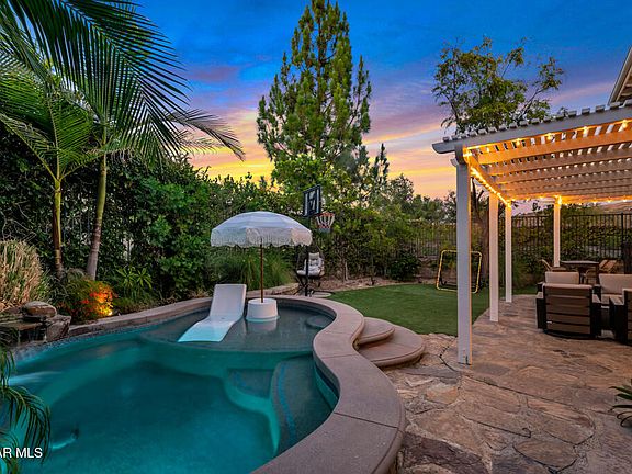 Step outside to your private backyard oasis, where relaxation and entertaining come together. Enjoy the oversized ''spool'' (spa/pool combination) with Pebble Tec finish, stacked stone accents, Baja shelf, and tranquil rock waterfall. A covered patio creates the perfect space for outdoor dining or lounging, surrounded by beautifully designed drought-tolerant landscaping with high-quality artificial turf for year-round beauty and low maintenance.
