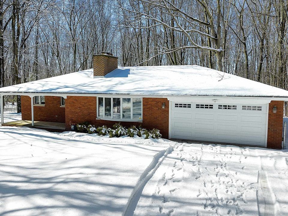 All brick, split bedroom, ranch style home featuring 4 bedrooms & 2 full baths on 1.26 wooded acres! Features include large master bedroom w/sliding doors to deck & patio; main level laundry; kitchen area w/snack bar, pantry & appliances included; dinette w/sliders to backyard; large living room w/wood burning fireplace and bump-out window for lots of natural light; 3 bedrooms (2 w/hardwood flooring); finished rec room in LL w/wood burning fireplace; firepit and fenced dog area in backyard; 2 stall attached garage. New furnace September 2021. Radon system installed. Water softener is owned and has not been used recently. Driveway easement attached to RECR.