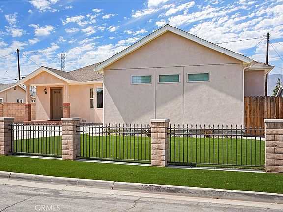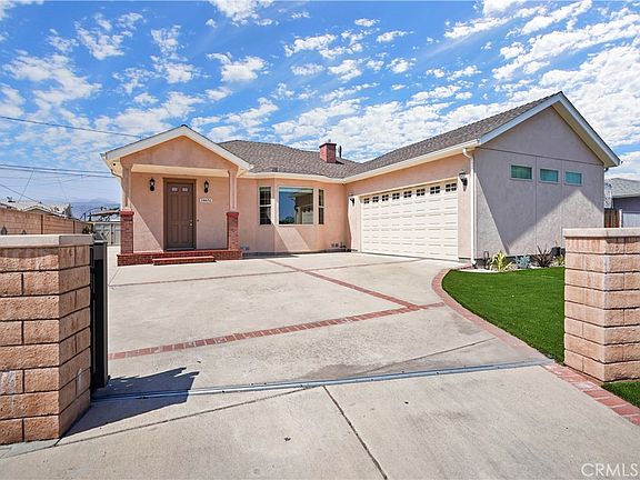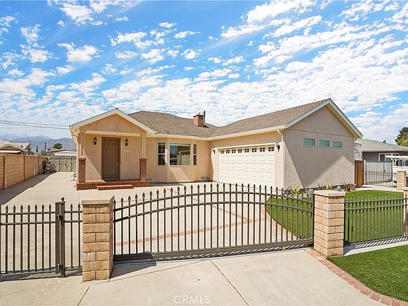 Don’t miss this custom-built, single story 4 bed, 2 bath home in a quiet cul-de-sac w/ an automatic gate, 90 ft driveway, 9 ft ceilings, crown molding & Pergo waterproof floors. This property features a one-of-a-kind 614 sq ft, insulated, drywalled, air conditioned, oversized garage with 15ft vaulted ceilings to accommodate a car lift, and a 400 sf boarded floor attic area with insulated roof! The whole house was renovated in 2018 with NEW WALLS and ROOF FRAMING, and COMPLETELY NEW WATER, GAS, SEWER, MECHANICAL and ELECTRICAL SYSTEMS. The open floor plan in the living room, kitchen and dining area allows for easy gatherings or keeping an eye on kids while you’re preparing dinner. Enjoy the built-in surround sound with karaoke or movies in the spacious living room with recessed ceiling and lighting in front of a cozy gas fireplace. French doors from the dining room open directly to a paved patio area in the backyard, allowing for easy al fresco dining. The gourmet kitchen impresses with expansive quartz countertops, stone tile backsplash, an island, and a complete suite of LG stainless steel appliances. The double oven range includes an exterior vented hood, while abundant storage includes a custom built-in pantry and soft-close cabinets/drawers. The spacious primary suite includes a recessed ceiling, an en-suite bathroom with a custom dual vanity and frameless glass shower/tub. A walk-in closet includes built-in shelving for optimal organization. Three other bedrooms each have great natural light and abundant storage space. The second bathroom is fully updated with 3 built-in medicine cabinets and elegant subway tile. The massive garage is equipped with a mini-split AC system for year-round comfort, great LED lighting, laundry area with washer/dryer connections, utility sink, and a space designed for a car lift to create a versatile multi-purpose area for a workshop, workout area, office or game room. An 8 ft tall x 18 ft wide oversized garage door allows you to park large vehicles inside. Finish the 400 sq ft attic with 7 ft clearance into a loft or extra storage room. The backyard is completely flat and usable, featuring drought-resistant landscaping, automatic irrigation and low-maintenance turf. A custom-built shed protects tools and equipment from the elements, plus 4 tool sheds included! The location is ideal, just minutes to I-210, 57, and 10, shopping and restaurants in downtown Covina, hiking, golf, and parks! This home checks all the boxes!