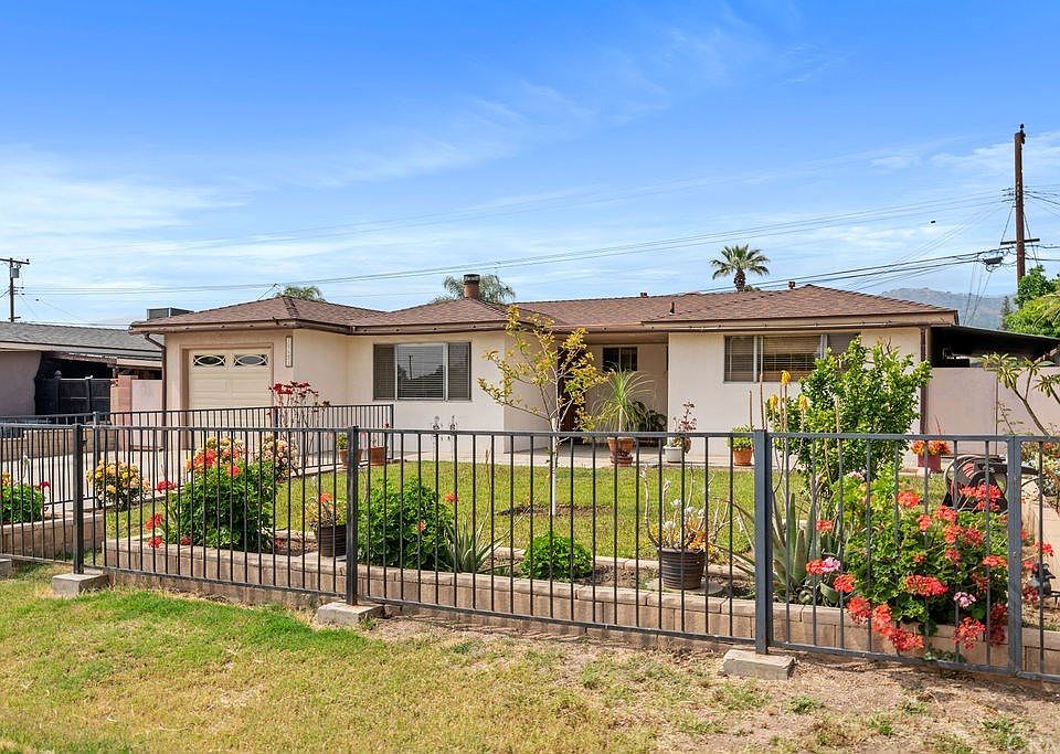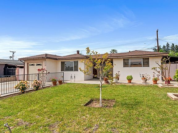Come take a look at this cute home in a very desirable location! Front yard is nicely landscaped with trees, flowers, grass and a very attractive wrought iron fence. Enter into a huge living room with cozy fireplace. There is a separate dining area and a good sized kitchen. Leading to the backyard is a very large laundry room with a pocket door. There is also a large permitted family room/play room/sun room at the back of the house overlooking the beautiful pool. Down the hall are 4 bedrooms and two bathrooms. All the flooring in the house is either wood or tile, so it's clean and move in ready. This home has good sized windows all around so you can enjoy lots of natural light. Back yard features a pool and spa plus a covered patio and another covered area to sit and sip your drinks and enjoy the pool. One side of the house has a covered area for workshop, tools, etc. Backyard is surrounded by block wall fencing. Front driveway is concrete and has plenty of room for parking. This a clean house that is move in ready and just waiting for a new family to love it like this one has!