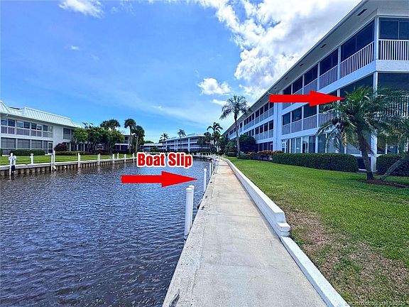 Waterfront living at its finest in Windjammer! This bright and airy end-unit offers extra windows, a spacious wraparound screened porch, and gorgeous views of the river and your private 25’ boat slip just steps away. Inside, enjoy LVP flooring in the living areas and kitchen, an updated kitchen with raised-panel white cabinets and solid-surface counters, a refreshed master bath with newer vanity and lighting, and a completely renovated guest bath. 2020 A/C and water heater for worry-free comfort, plus complete accordion shutters. Owner is installing new carpet in Master bedroom, Lanai will be restored to original configuration and new closet doors in second bedroom. Windjammer is a 55+ boating community with 3 heated pools, active clubhouse, yoga, water aerobics, and more. Close to Historic Downtown Stuart with charming shops, dining, and riverfront.