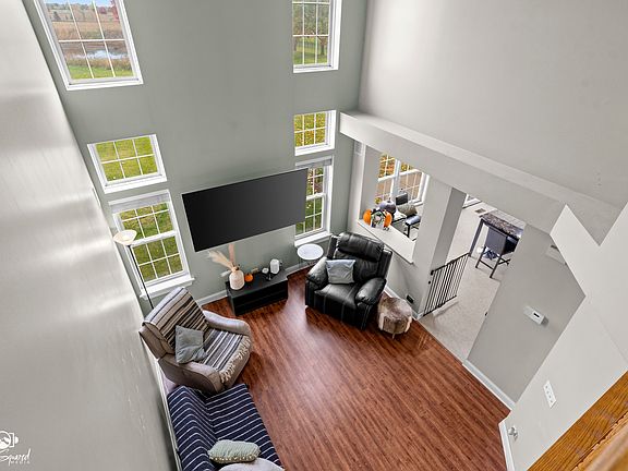 Step into this exceptional two-story entryway, leading into a grand foyer and living room with soaring cathedral ceilings. Enjoy your favorite movies and music on the wired surround sound system. The spacious kitchen offers ample cabinet and counter space and opens seamlessly to the main living area, perfect for both everyday living and entertaining. Upstairs, you'll find two generously sized bedrooms, including a private primary suite with double-door entry, a walk-in closet, and a full bath. Convenient second-floor laundry adds ease to your daily routine. Step outside to a peaceful patio overlooking open green space, ideal for relaxing or enjoying quiet evenings outdoors. Investors welcome! This property is rentable and conveniently located near shopping, dining, parks. A wonderful opportunity!