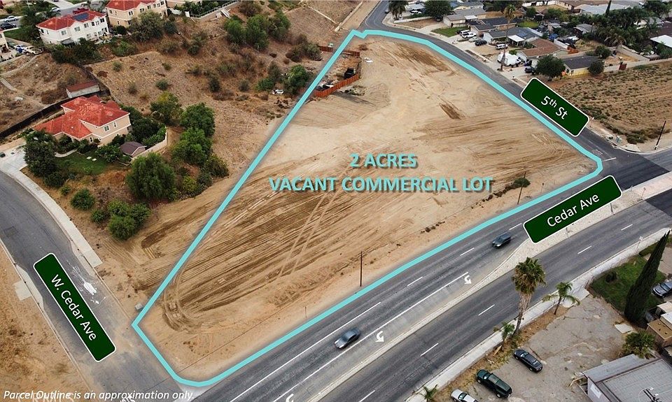 We are pleased to present a prime 2.01-acre commercial parcel located at 18661 5th Street in Bloomington, California. The property spans nearly an entire block between 5th Street to the north and W. Cedar Avenue to the south, featuring over 370 feet of frontage along Cedar Avenue, a key retail arterial with traffic counts exceeding 21,800 vehicles per day (per CoStar).