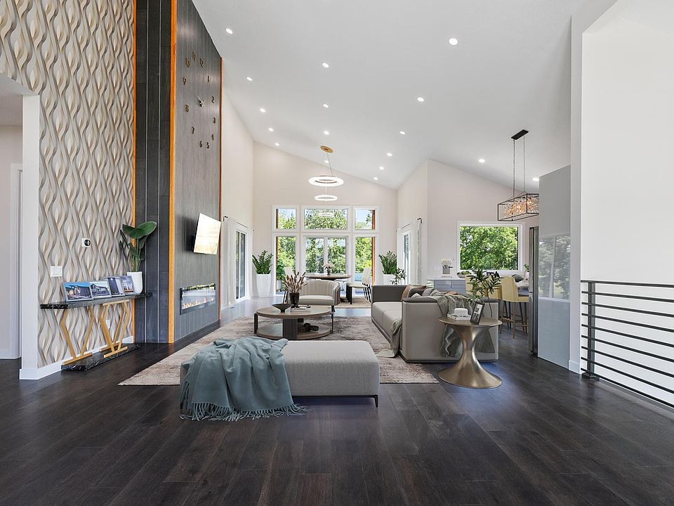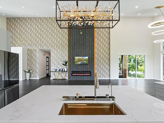 Step inside and you’ll be greeted by soaring ceilings ranging from 10 to 22 feet, casting natural light across open-plan living spaces defined by warmth and luxury. A welcoming great room, anchored by a sleek electric fireplace, flows effortlessly into a dining area, both of which offer stunning views of the water and direct access to the outdoor deck. The chef's kitchen is the heart of this home, featuring stainless steel appliances, an island, and space for entertaining family and friends.