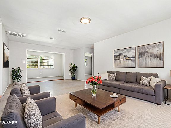 Charming single-family residence featuring an open-concept layout that allows for a smooth flow between rooms. Upon entering, you are greeted by a delightful living room with a lovely window space that offers views of the stunning blue skies, a true FL retirement haven! The residence boasts travertine flooring throughout, complemented by new carpeting in the bedrooms! The kitchen cabinets provide ample storage, with the sink located to overlook the nice porch! The spacious screened-in porch offers plenty of room for an afternoon coffee break, and for children to enjoy and play. The huge front yard is exceptionally green, and the driveway can accommodate up to four vehicles. A sturdy wood and metal shed for extra storage in the backyard! Your roof is about 12 years old, and the HVAC and water heater system are about 15 years old. Location! This property is located in a quiet neighborhood, and conveniently close to beach activities. Make this charming home yours today!