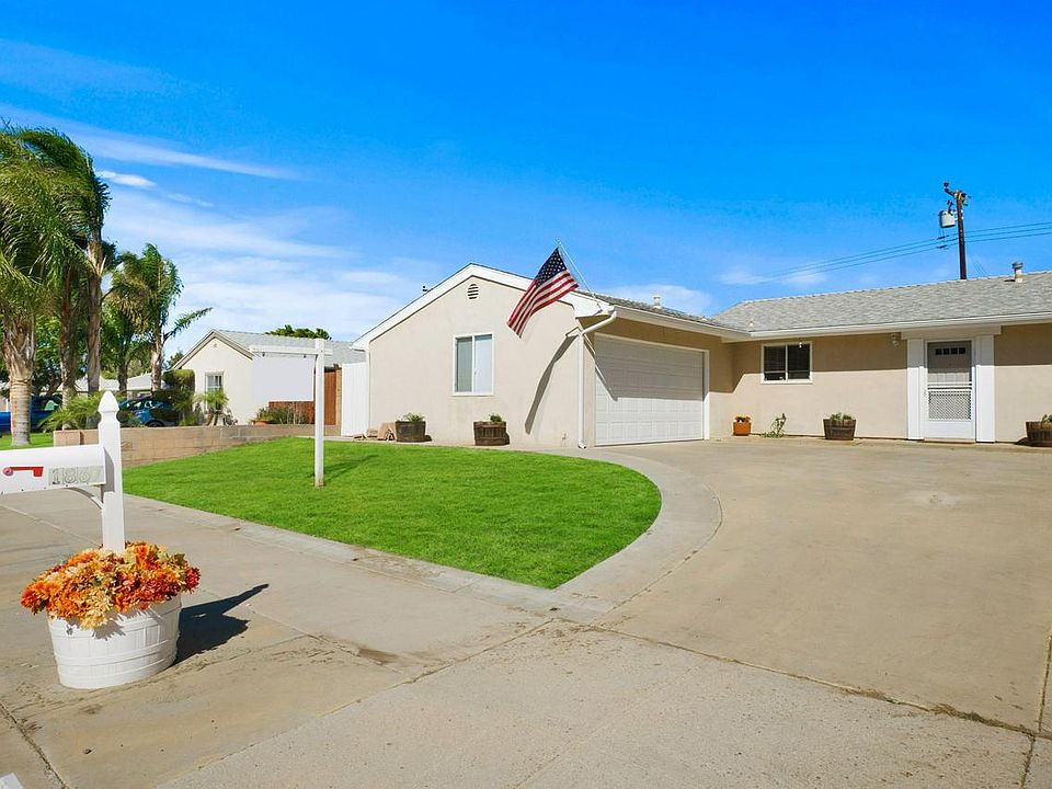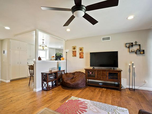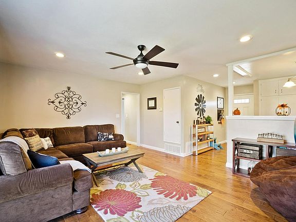 Fabulous property with large front and back yard. 4 bedroom plus 1.5 baths. Beautifully upgraded wood flooring in entryway, kitchen living room and 4th bedroom. Light bright and airy kitchen with lots of counter space, eating area & newer stove-oven and microwave. Three Bedrooms have lush cut berber carpet. Lovely living room with slider to back yard patio and recessed lighting. Master with large his and hers closets attached to gorgeous remodeled bathroom. Ceiling fans in all bedrooms and living room. Central heat and air. Two car garage. Back yard is super spacious with wrap around patio. Paved and gated RV access.