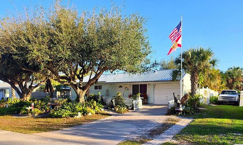 Opportunity to own an abundantly landscaped 0.25 acre, 2 bedroom, 1.5 bath home with bonus room and a 682 sqft detached garage/workshop in a peaceful waterfront community. Great neighborhood for walks and bikes. Boat ramp, Schools, post office, government buildings, shopping, mall and Port Charlotte beach all within 5 miles! Gulf beaches within 20 miles. This 1,100 sq-ft North facing home has a new, well ventilated, Metal Roof, new a/c air ducts with UV ionizer and recently upgraded Central heat and air units. The exterior decorative corner coining and shutters are hand-crafted concrete architecturals. A Bonus room with a large window in the garage attached to house easily converts to a third guest bedroom, office or den with separate side door entrance from garage and attic stairs for additional storage. Newly upgraded kitchen cabinets floor to ceiling, Pantry and new fixtures for bathroom sinks. Huge 22 x 31 ft Detached garage/workshop has Twelve foot walls, insulation, 220v electric and a decorative paver floor. 2 10x10 roll-up doors, 3 man doors with windows, 4 decorative windows and thermal automatic gable vent fans complete this workshop/garage. A separate driveway entrance to detached 682 sq-ft garage will not disturb fenced back yard. An additional 10x11 storage shed just behind house and another playhouse or garden-house storage. Metal Hurricane window shutters are easily installed with wing nuts and artist painted to match if left on while you are away. Enjoy the unique landscaping providing shade at all times Additionally large patios of pavers and 2 concrete tables makes shaded garden living enjoyable. One centennial oak surrounded by pavers and decorative palms shades the backyard gardens. A nice garden area in the East side backyard. Two centennial oak trees frame the front yard providing shade for numerous birds, flowering plants, herbs and a central tiled concrete seating area. A smaller picket fence frames the front landing, just behind a koi pond. A Large paver patio adjacent to back of home is a great place under canopy for picnic table or your future screened lanai/pool. Numerous herbs and fruiting trees are maturing in your garden of Eden. This sub-tropical home has these and more: Papayas, moringa, avocado, citrus, banana, tamarin, lemongrass, ginger, Thai Basel, dragon fruit, miracle leaf, coconut, mango, etc. large star lilies frame the property side lines. Currently owner occupied. Additional time to move after closing would be mutually beneficial. The sellers are dedicated to a smooth and fair transition for you and your family.