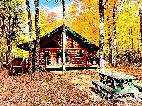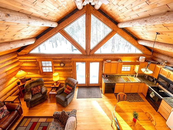 Three-bedroom two-bath log homeSpacious interiorsVaulted ceilingsRelaxing on the deck