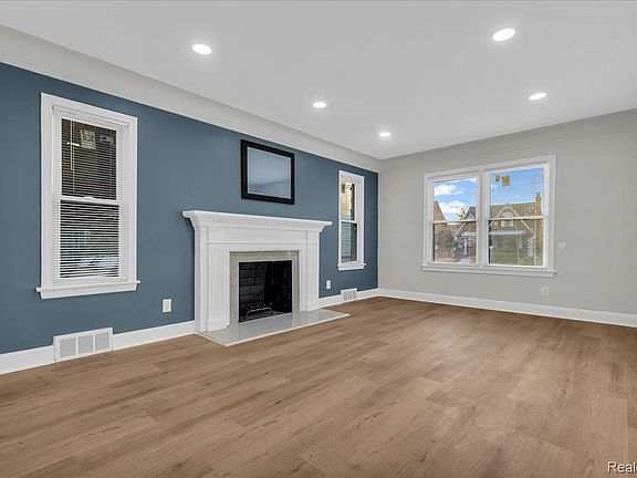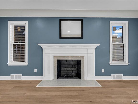 Step into a bright and welcoming entryway that immediately sets the tone with its fresh updates and clean, modern feel. The spacious living room features rich wood-look flooring, recessed lighting, and a beautiful accent wall that frames the elegant white fireplace. Large windows fill the room with natural light, creating an airy and inviting atmosphere perfect for relaxation or entertaining.