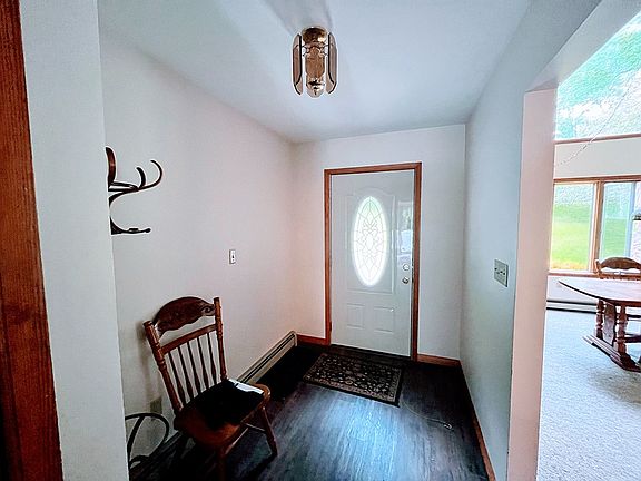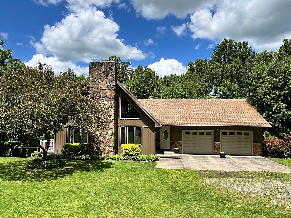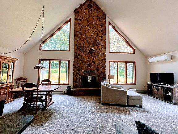 Serenity awaits you in this Chalet-style, 4 bed, 3 full bath house nestled on over 6 acres of manicured lawn and woods. The updated kitchen boasts granite counters, stainless appliances, 4 burner gas stove, and quality Kraft softclose cabinetry. New carpet, flooring and paint throughout the house. Enjoy a fire (gas or wood) in the family room, with tons of natural light and vaulted beam ceilings. Head to the lower level game/family room for watching the big game! 4 garage bays, two at main level (extra storage above) and 2 below for all those country toys. Two workshop areas for the handyperson in your family. 3 heat sources, gas, wood burner, 3 pumps which also are for A/C.