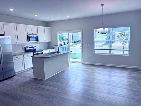 Luxury vinyl plank flooring greets you as you step into this beautiful new construction home. The wide entryway leads into an open-concept living room and kitchen featuring a stylish backsplash, stainless steel appliances, and granite countertops.