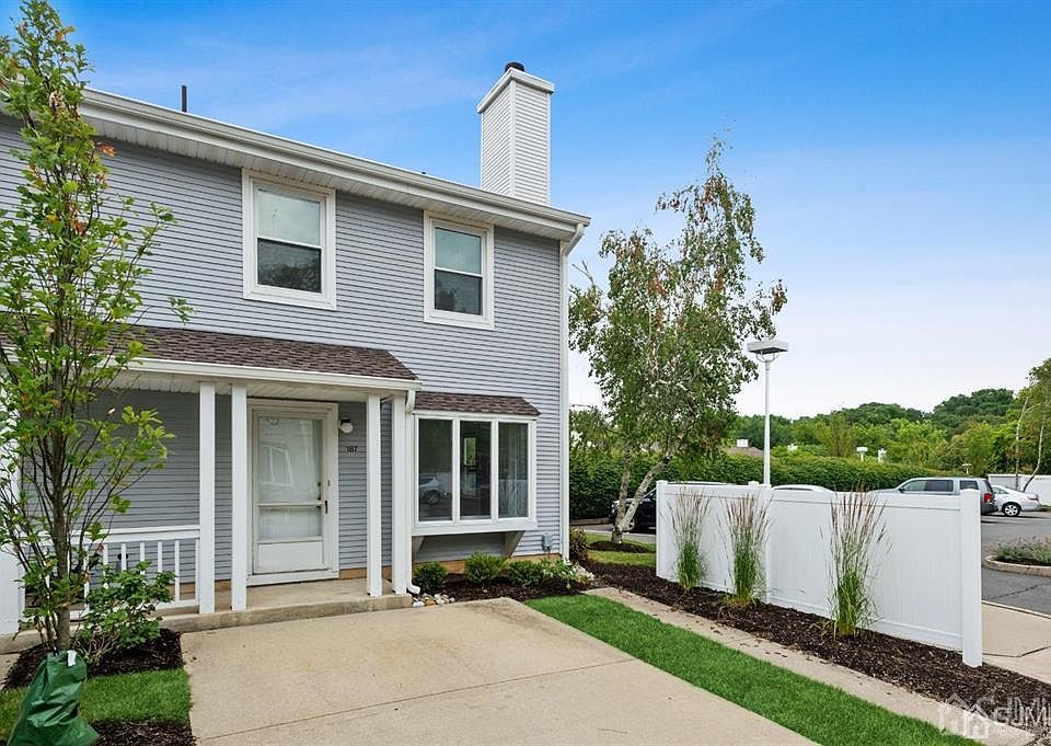 Situated on well-kept grounds in the community of Griggs Farm in Princeton, this superb end-unit townhome has a covered front porch, driveway, and is freshly painted inside w/newer flooring! In the living room, a wood-burning fireplace flanked by 2 windows allows for plenty of natural light and the oversized front window has a sill deep enough to be decorated by your favorite plants. The renovated kitchen offers plenty of cabinets for storage, generous counter space, a window above the sink overlooking the back yard, and tile floor. Adjacent is the dining room, bright and airy, w/a ceiling fan w/lights and sliding doors leading to the partially private back patio and shed. A remodeled powder room on this level conveniently houses the stacked washer/dryer. On the second level you will find 2 bedrooms w/dual closets, as well as a renovated hall bath w/shower/tub combo. Community amenities: Trails, Playground, tennis courts, short distance to NJ transit bus stop, and award winning Princeton schools.