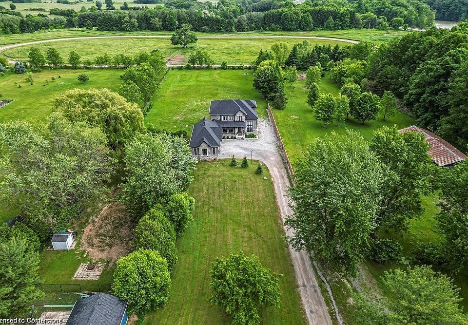 Experience refined country living in this custom-built 2-storey home, privately set 350’ back on nearly 2 acres with sweeping pastoral views. A grand foyer with 20’ ceilings and porcelain floors sets the tone for the quality and craftsmanship throughout. The chef’s kitchen impresses with quartz counters/backsplash, high-end appliances, 8-burner gas range, cappuccino bar, and walk-in butler’s pantry, opening to the Great Room with 10’ coffered ceilings, hardwood floors, gas fireplace, custom lighting, and built-in sound. Entertain indoors or out with the expansive covered deck. A formal dining room with 15’ coffered ceilings and oversized windows captures natural light and scenery. On the upper level, 9’ ceilings enhance the serene primary suite with spa-inspired ensuite, plus a second bedroom with private 4-pc bath and two more bedrooms sharing a 5 pce. Jack & Jill bath. The fully finished lower level offers a large rec room (rough-in for kitchen or wet bar), gym, storage, and two additional bedrooms—each with their own bath—perfect for in-law or multi-generational living. Additional highlights include: a 4.5-car garage with inside entry to spacious mudroom with laundry room w/ built ins, side by side washer & dryer & lge. walk in closet, the fully fenced deep backyard with room for your dream oasis, would that include an inpool, court &/or gardens. A rare blend of space, sophistication, and flexibility—your private oasis awaits.